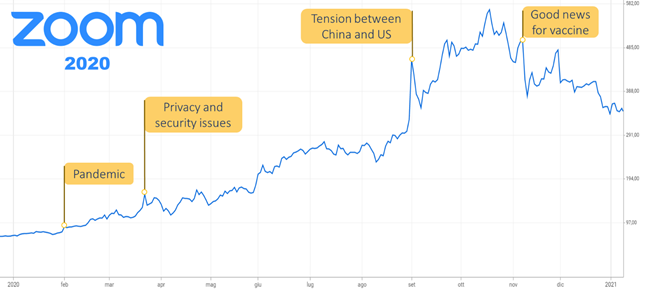 In 2019, finally, Zoom became a listed company. A year later, the video conferencing software had the largest market share (36%). As you can see in the graph, the stock in 2020 has undergone many variations. Starting from February, the pandemic has pushed many people to use this software and the share started to rise exponentially until October. They decreased slightly between March and April due to privacy and security problems: thousands of Zoom video calls were exposed on the open Web and have been hacked, leading many companies and users to change platforms. In September, instead, Trump signed the order to ban Tiktok and WeChat, influencing heavily Zoom. Toward the end of 2020, stocks fell again following vaccine advances.